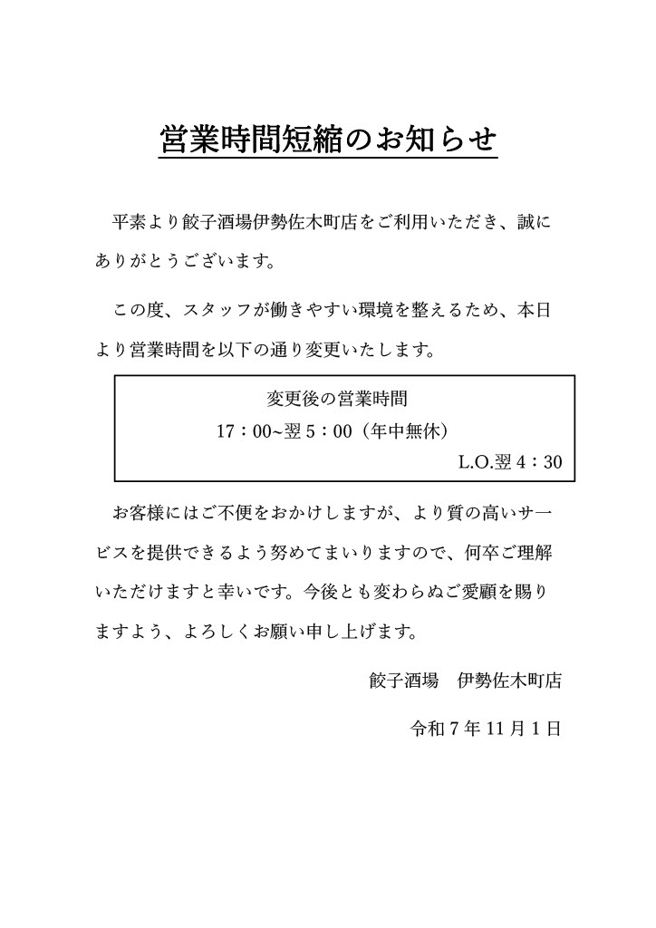 2025-10-28 / 最終更新日時 : 2025-10-28 gyozaisezakicho3141 お知らせ・最新情報 2025年11月1日からの営業時間変更のお知らせです。 \ 最新情報をチェック / FacebookXBlueskyHatenaCopy コメントを残す コメントをキャンセルメールアドレスが公開されることはありません。 ※ が付いている欄は必須項目ですコメント ※ 名前 ※ メール ※ サイト 次回のコメントで使用するためブラウザーに自分の名前、メールアドレス、サイトを保存する。 上に表示された文字を入力してください。 Δ